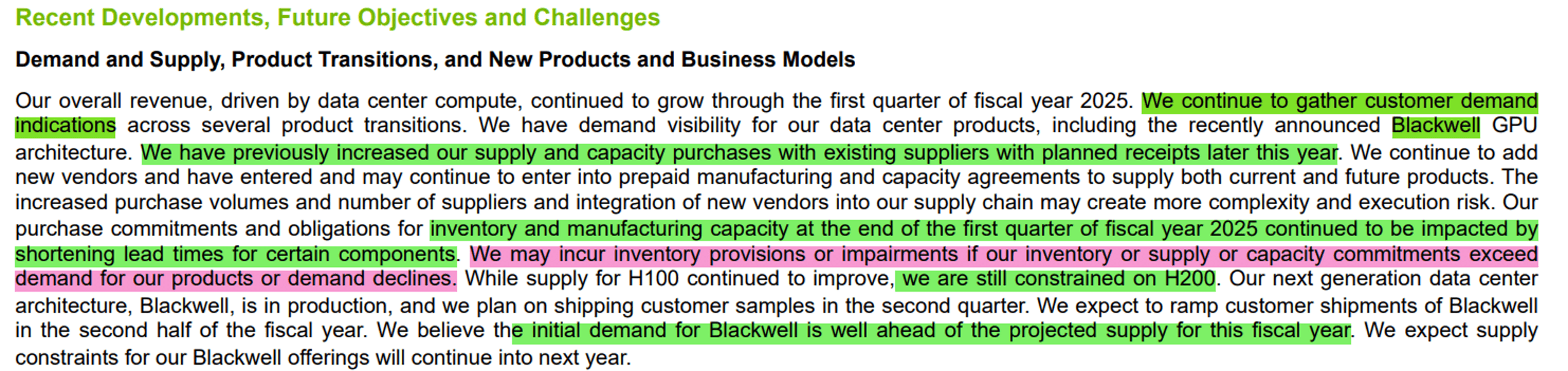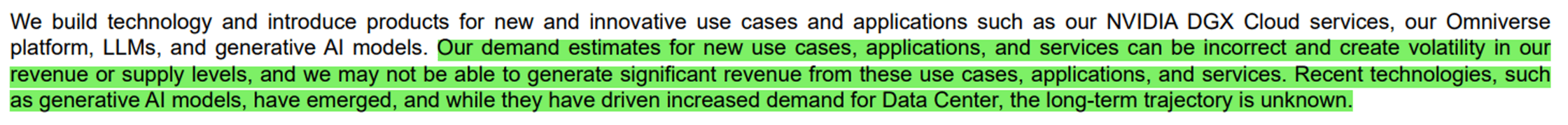 The first risk is uncertainty around the synergies of some AI use cases, both in terms of profitability and timeline. The predictable result would be less future demand for Nvidia, and potentially an oversupply of inventory.