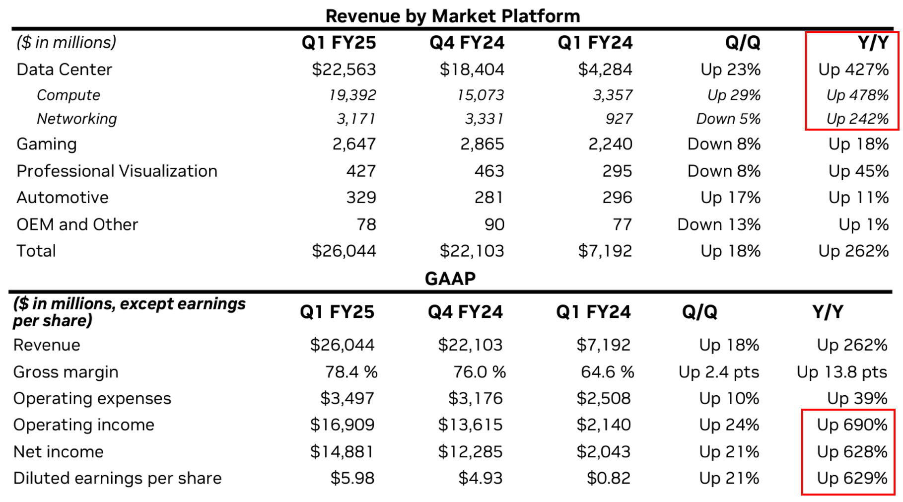 The other two themes, Nvidia’s market position and exceeding expectations, have also remained strong. Nvidia once again crushed estimates in Q1, adding to its streak of 8 consecutive quarterly beats. Data Center revenue and bottom-line profitability were the stars last quarter: