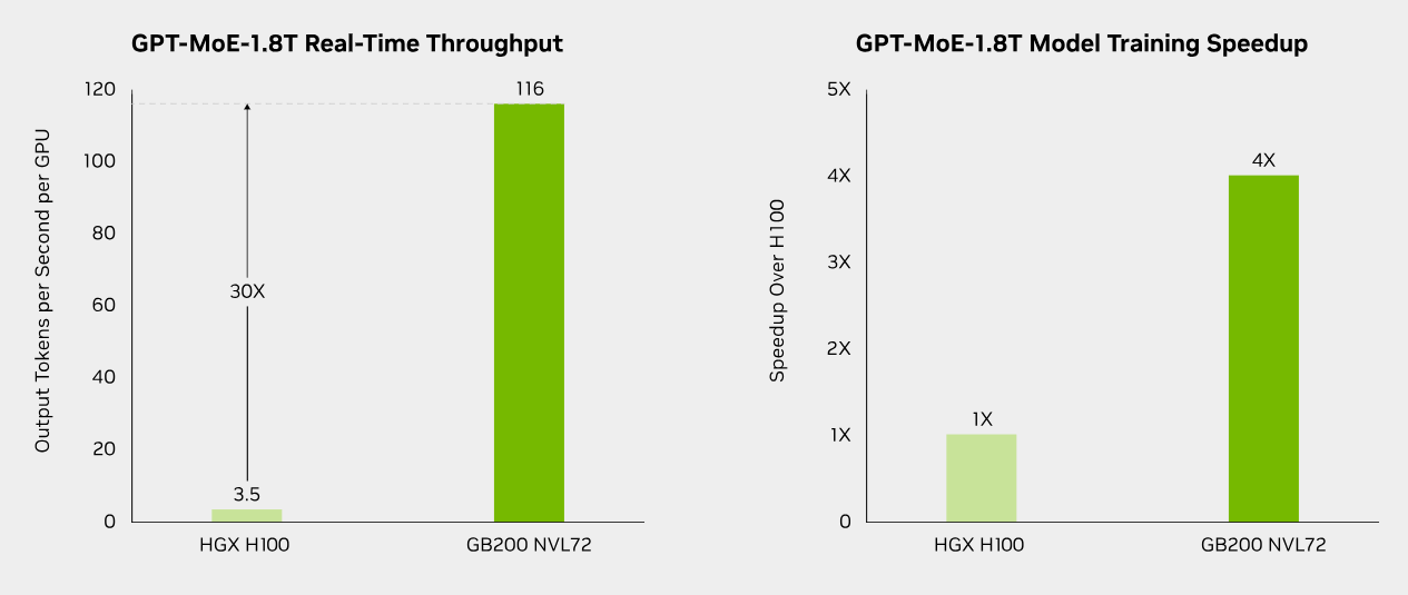 GB200 NVL72 will feature four times as fast model training speed as H100 and thirty times as much real-time throughput. Moreover, it’s worth recognising that GB200 will have 25 times higher energy efficiency than H100.