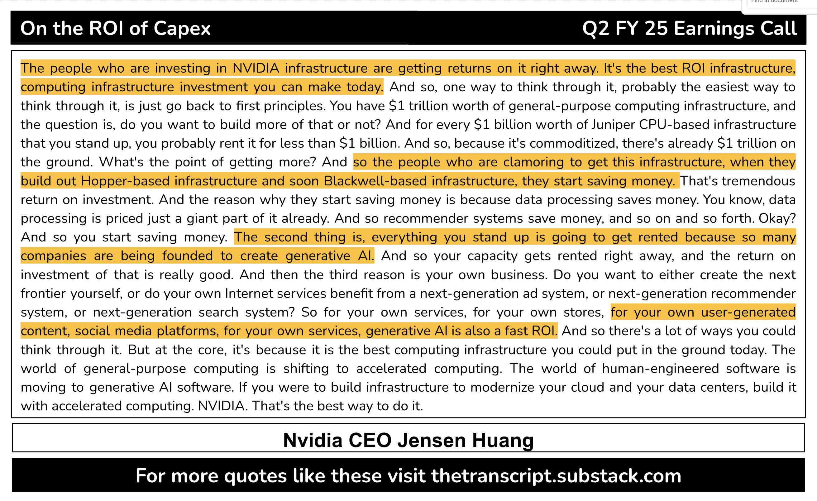 I think there is another very important point Jensen Huang said in the earnings call about the return on investment and demand for Nvidia’s GPUs.