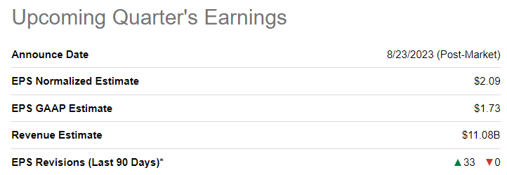 Going into the Q2 FY2024 earnings report, Nvidia was projected to deliver revenues and Normalized EPS of $11.08B [up +65% y/y, estimate range: $10.59B to $12.00B] and $2.09 [up +309% y/y, estimate range: $1.76 to $2.49], respectively.