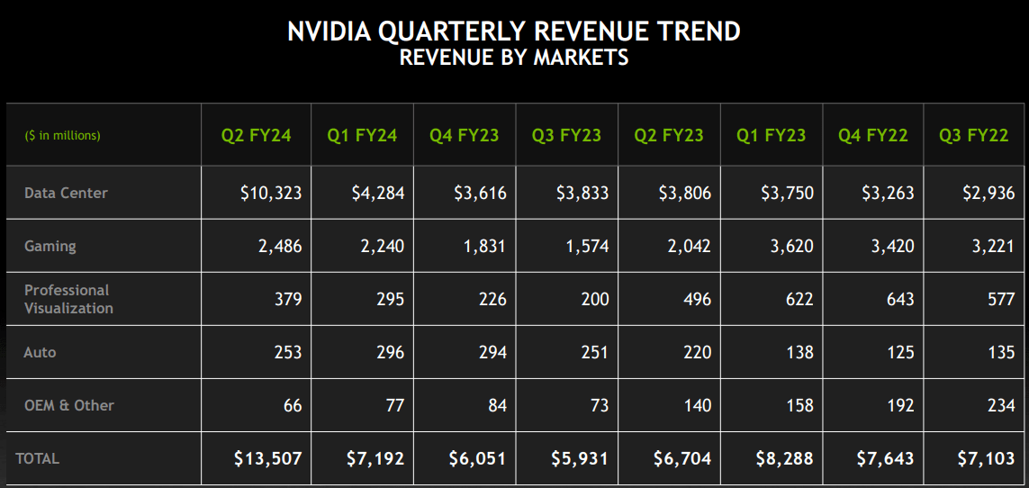 While Nvidia is clearly a data-centric business now and going forward, strong performance in Gaming was an additional gift for shareholders in Q2 FY2024. Now, Nvidia’s Professional Visualization and Auto business segments are still down on a y/y basis; however, the long-term outlook for these businesses is also incredibly bright.