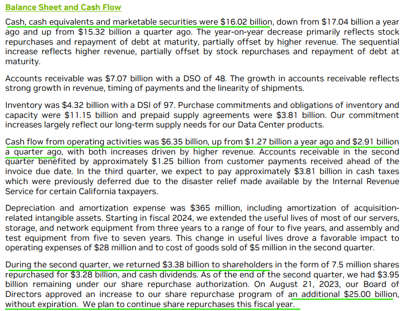 During Q2 2023, Nvidia bought back shares 7.5M shares for $3.28B at an average price of ~$437 per share. Furthermore, Nvidia’s management announced the authorization of an additional $25B for its share repurchase program and disclosed an intention to continue share repurchases in FY2024. Clearly, Nvidia’s leadership is bullish on their stock.