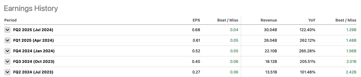 Ever since that report came in, the market’s perception was that the company needed to significantly beat the consensus estimates and meaningfully increase its guidance all the time for the shares to continue to trade at those high multiples. This has been the case in recent quarters so far. In Q3’24, Q4’24, and Q1’25, Nvidia beat the revenue consensus by a wide margin and announced a major guidance increase that was above the street expectations by a significant margin as well. Thanks to this, Nvidia’s shares rallied, and the company was able to become one of the most valuable businesses in the world in less than two years.