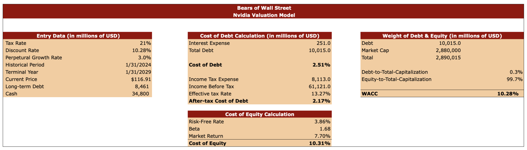 The discount rate in our model is 10.28%. The calculation for the discount rate is presented in the middle and right columns of the table, which can be seen below. First, we calculated the cost of debt and the after-tax cost of debt by using Nvidia’s TTM financial data. Then we calculated the cost of equity by using the risk-free rate of 3.86%, the beta of 1.68, and the inflation-adjusted market-return rate of 7.70%. In the end, we weighted Nvidia’s debt profile with its equity and figured out the discount rate.