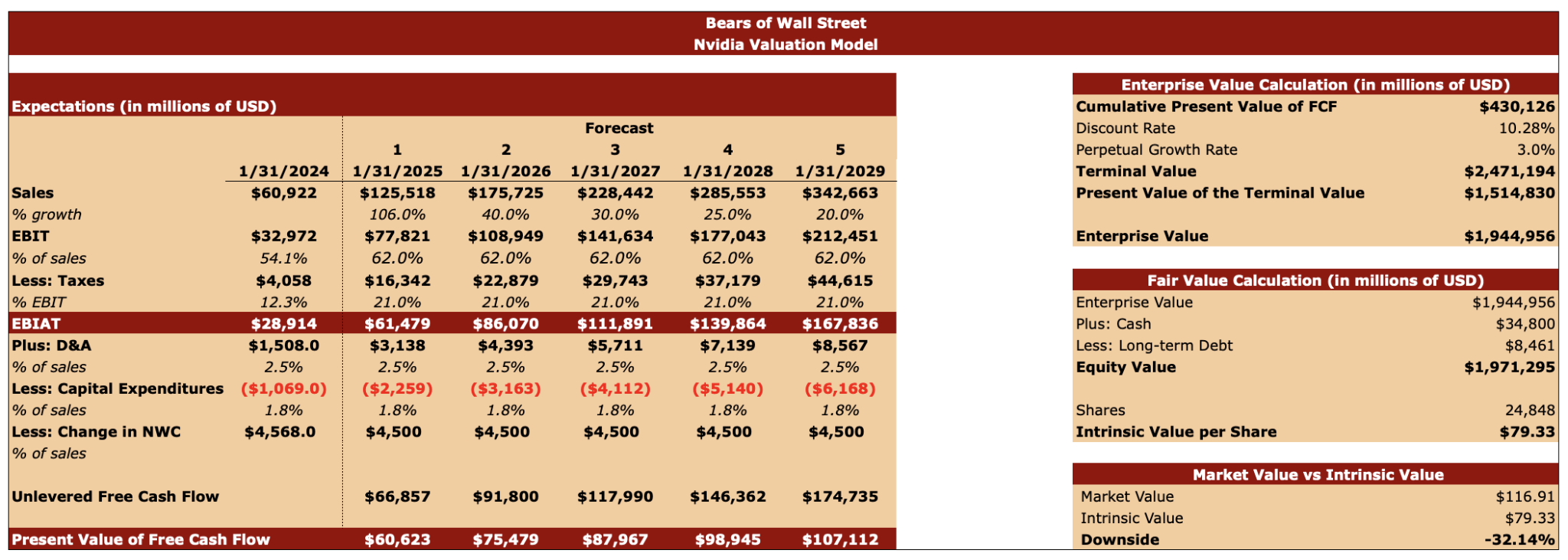 Once we filled in the entry data, we moved on to forecasting Nvidia’s growth in the upcoming years. The sales growth rate of 106% in the model is similar to the overall expectations for the current fiscal year. While the pace of growth is expected to subside going forward, the company still had strong growth at the beginning of this fiscal year, which is why in FY25 we’ll still see a triple-digit rate for sales. After that, a normalization of the growth rate is expected to happen and is reflected in our model. The EBIT as a percentage of sales is 62% in the model, which is close to the company’s historical performance in recent months. The tax rate is 21%, while the assumptions for the rest of the metrics closely match up with Nvidia’s historical performance.