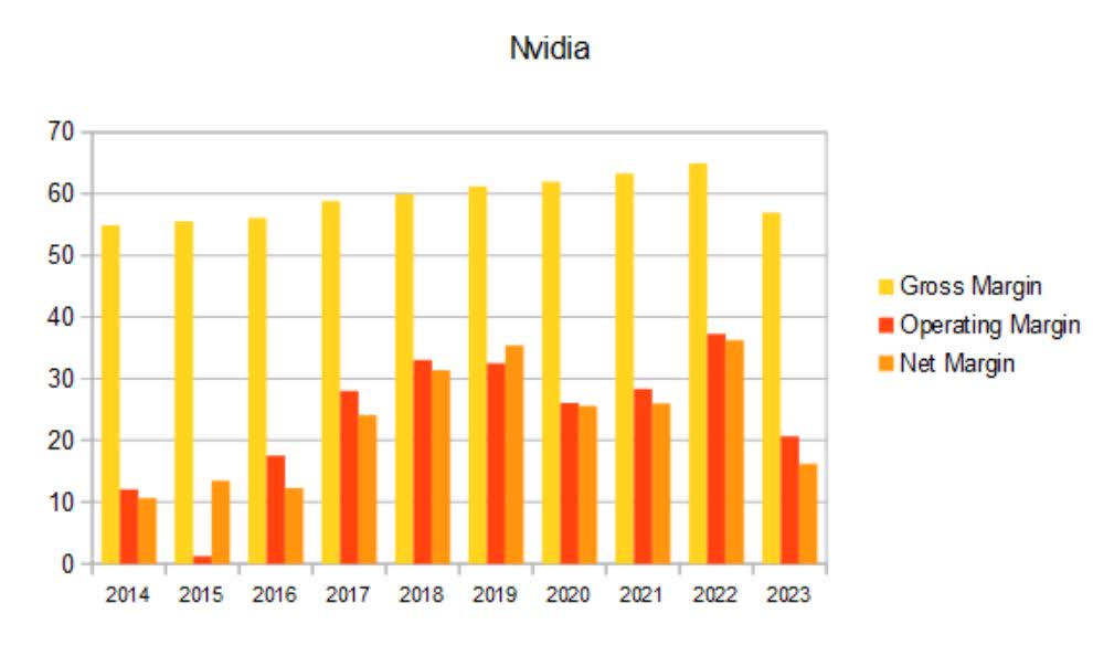 - Nvidia has excellent long-term growth, high margins, and very low debt.