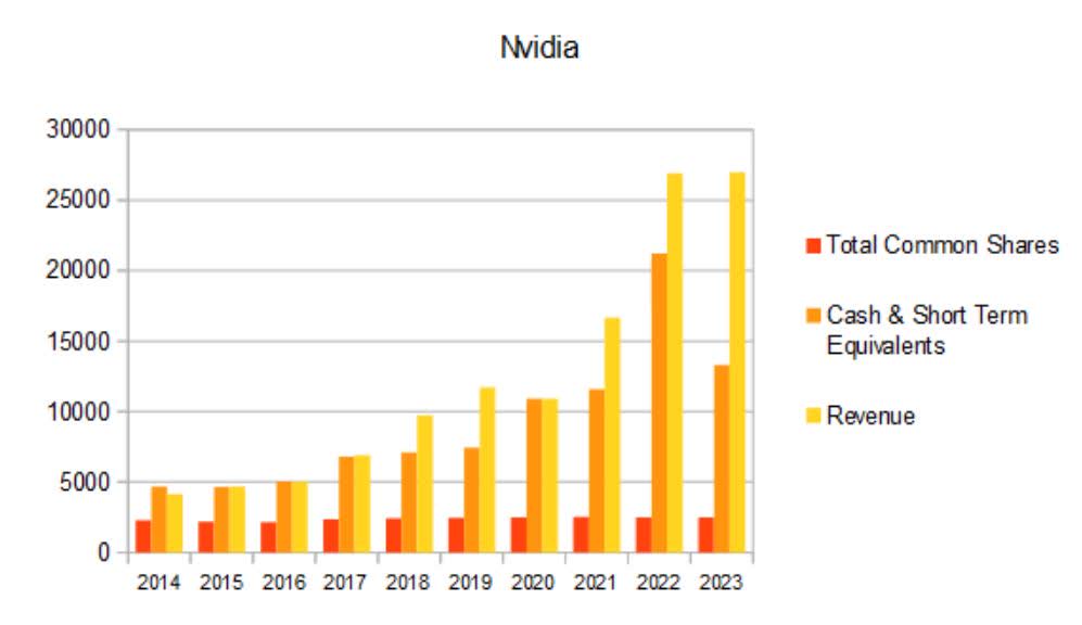 NVDA Annual Share Count vs Cash vs Revenue (By Author)