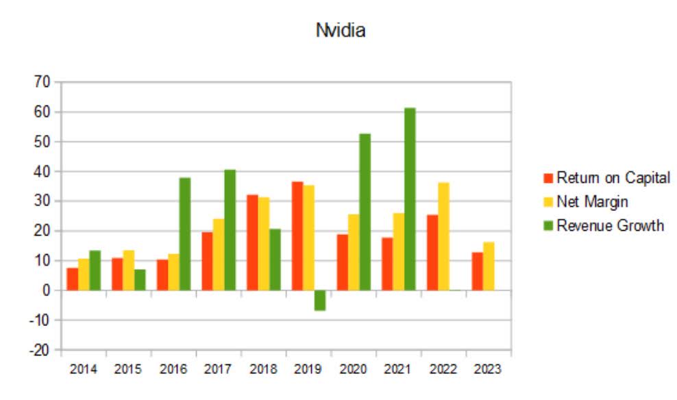 Typically, value investors want to see return on capital numbers stay consistently above 10%. Nvidia has stayed above 10% since 2015, and has even managed to achieve ROC above 30% in 2018 and 2019. Overall this looks really strong.