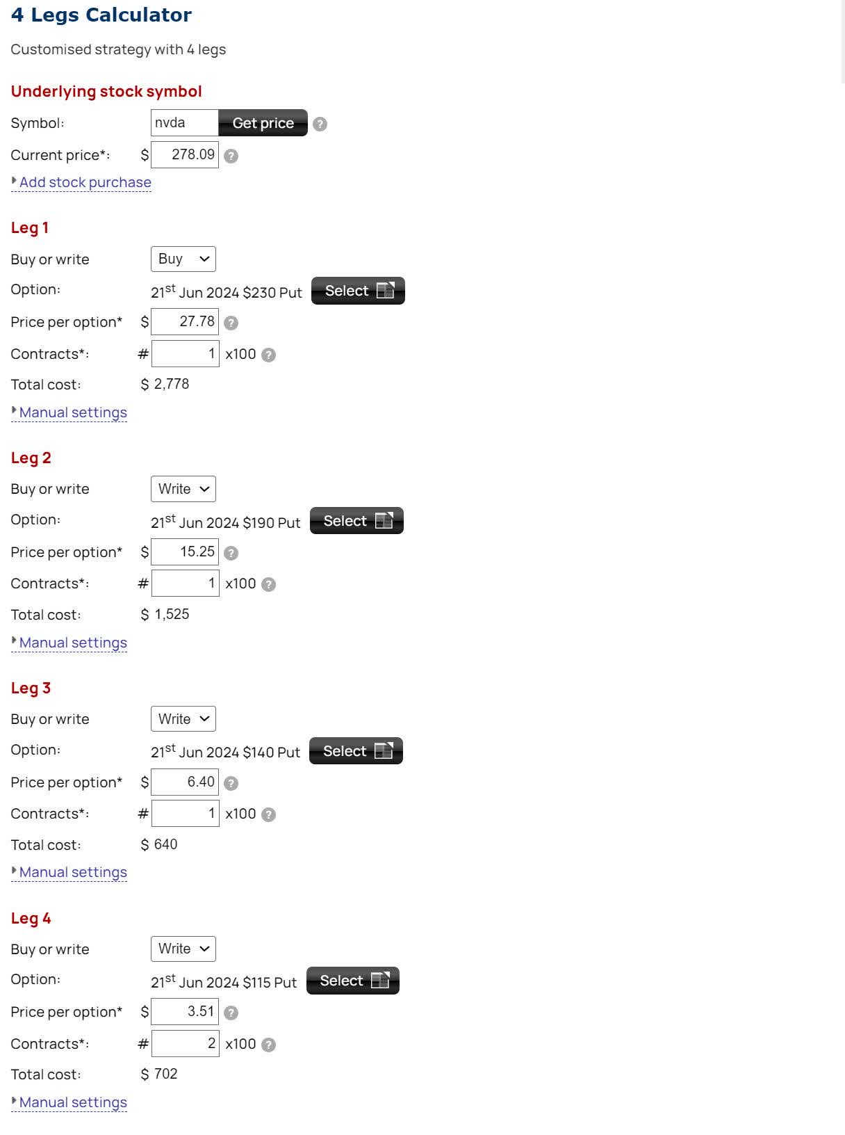 While looking at a two leg strategy, I was able to buy a 21st Jun 2024 $230 Put, and sell two 21st Jun 2024 $190 Puts, but this had a break even of $147.27. I wanted to try and get below $115 so I could either shift the entire trade to lower strikes or stretch it out by adding legs. Since stretching will also produce a wider profit range I chose to look at adding a third leg. I was able to buy a 21st Jun 2024 $230 Put, sell one 21st Jun 2024 $190 Put, and sell two 21st Jun 2024 $140 Puts. This had a break even of $119.85.