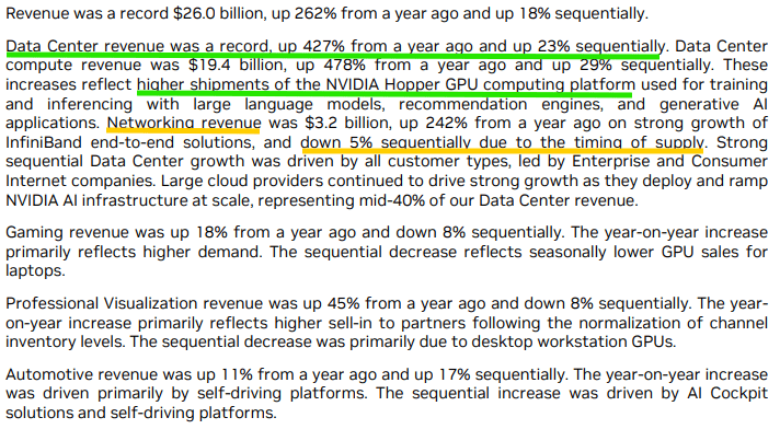 Once again, Gen-AI-induced demand for its AI GPUs drove remarkable +427% y/y growth within Nvidia’s Data Center business, which remains the primary driver of the explosive business growth Nvidia is delivering right now: