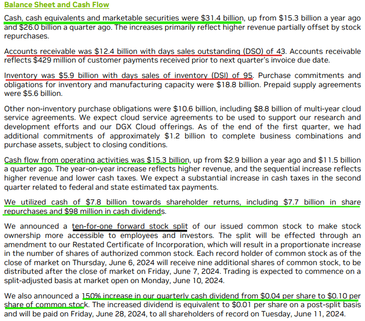 As of Q1 FY2025, the combination of explosive top-line growth and margin expansion is driving a massive AI windfall, with Nvidia’s quarterly operational cash flow jumping to +$15.3B in Q1 (up from $2.9B a year ago) [free cash flow: $14.94B]. Despite Nvidia returning $7.8B to shareholders via buybacks ($7.7B) and dividends ($98M) during Q1, the semiconductor giant’s fortress-like balance sheet keeps getting stronger, with cash and short-term investments position rising to $31.4B, up from $26B last quarter.