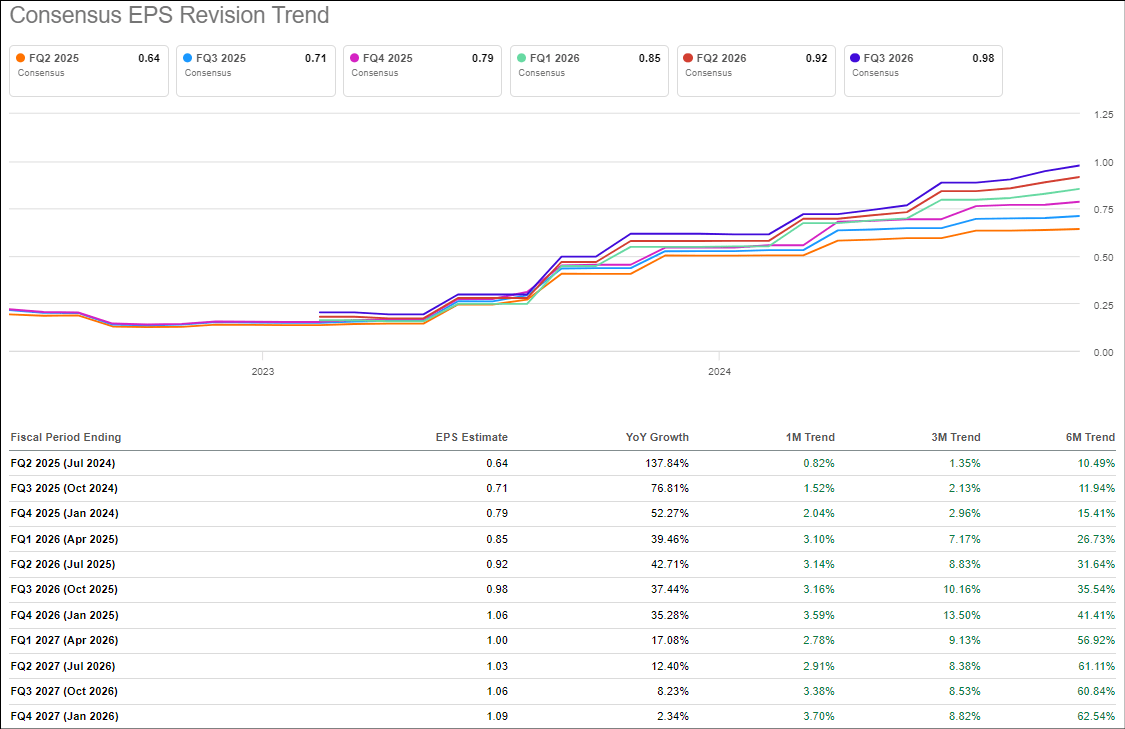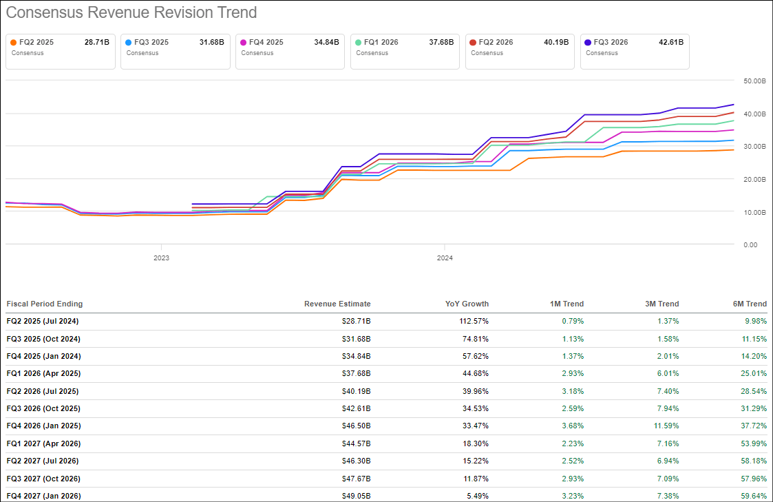 Furthermore, ahead of Nvidia’s Q2 FY2025 print, both revenue and earnings revision trends have been trending positive [i.e., analysts have been lifting their projections] with 13 “Revenue Up Revisions” and 19 “EPS Up Revisions”:
