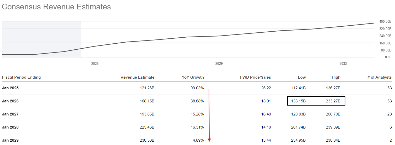 Now, some of you might consider our 5-year CAGR sales growth assumption of 25% to be overly conservative, given the range of analyst estimates for FY2026 [$133B to $233B] calls for a continuation of AI-powered hypergrowth next year as Blackwell comes to market! However, through our linear approximation, we are projecting $380B+ annual revenue in FY2029, which is well above current consensus estimates. Hence, I think underwriting even higher growth would be imprudent.