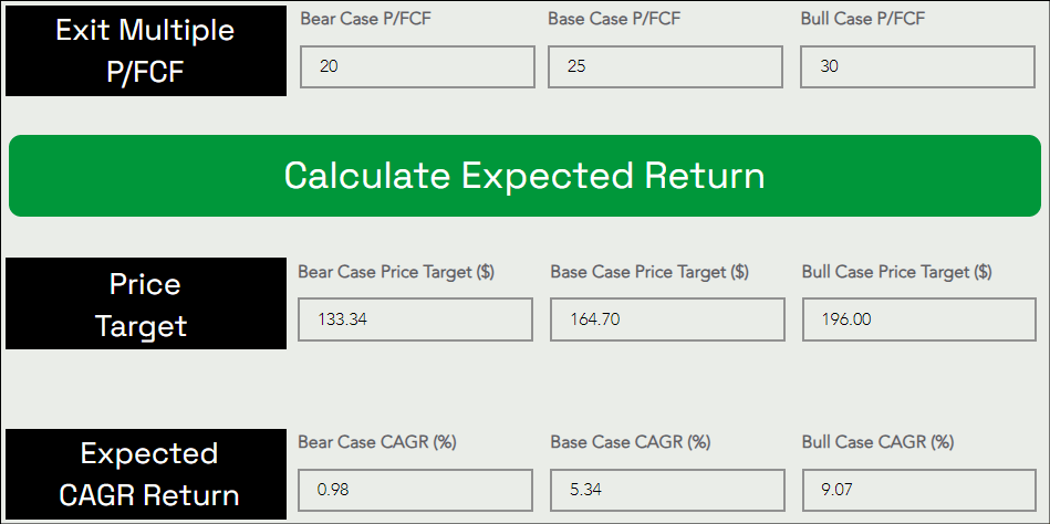 Assuming a base case P/FCF exit multiple of ~25x [ascribing a “quality” premium], we get to a 5-year price target of ~$165 per share, which implies a CAGR return of ~5.3%.