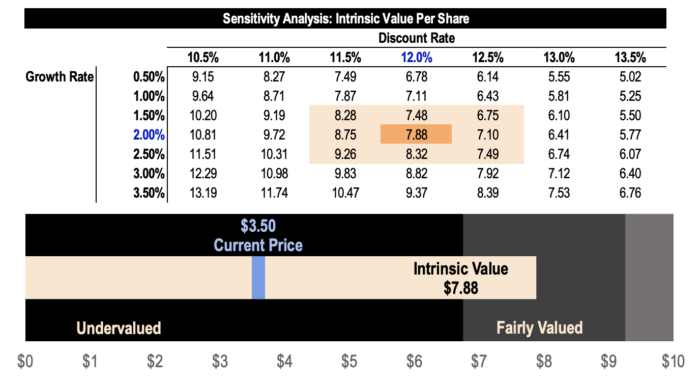 Assuming a discount rate of 12% and a perpetual growth rate of 2%, I arrive at an intrinsic value per share of about $7.88 for Opendoor, which is way higher than the average analyst price target of $3.31.