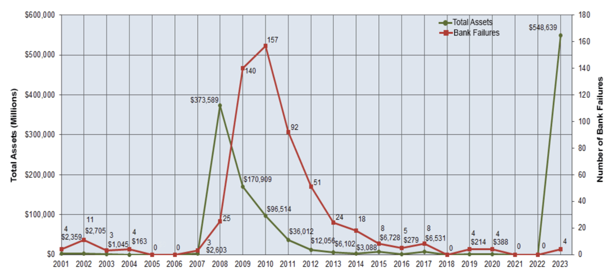 In 2023, four banks collapsed and although this number pales in comparison to the hundreds of banks that failed during the GFC, the total assets held by these four banks were much larger than the assets held by the hundreds of banks that failed during the GFC.