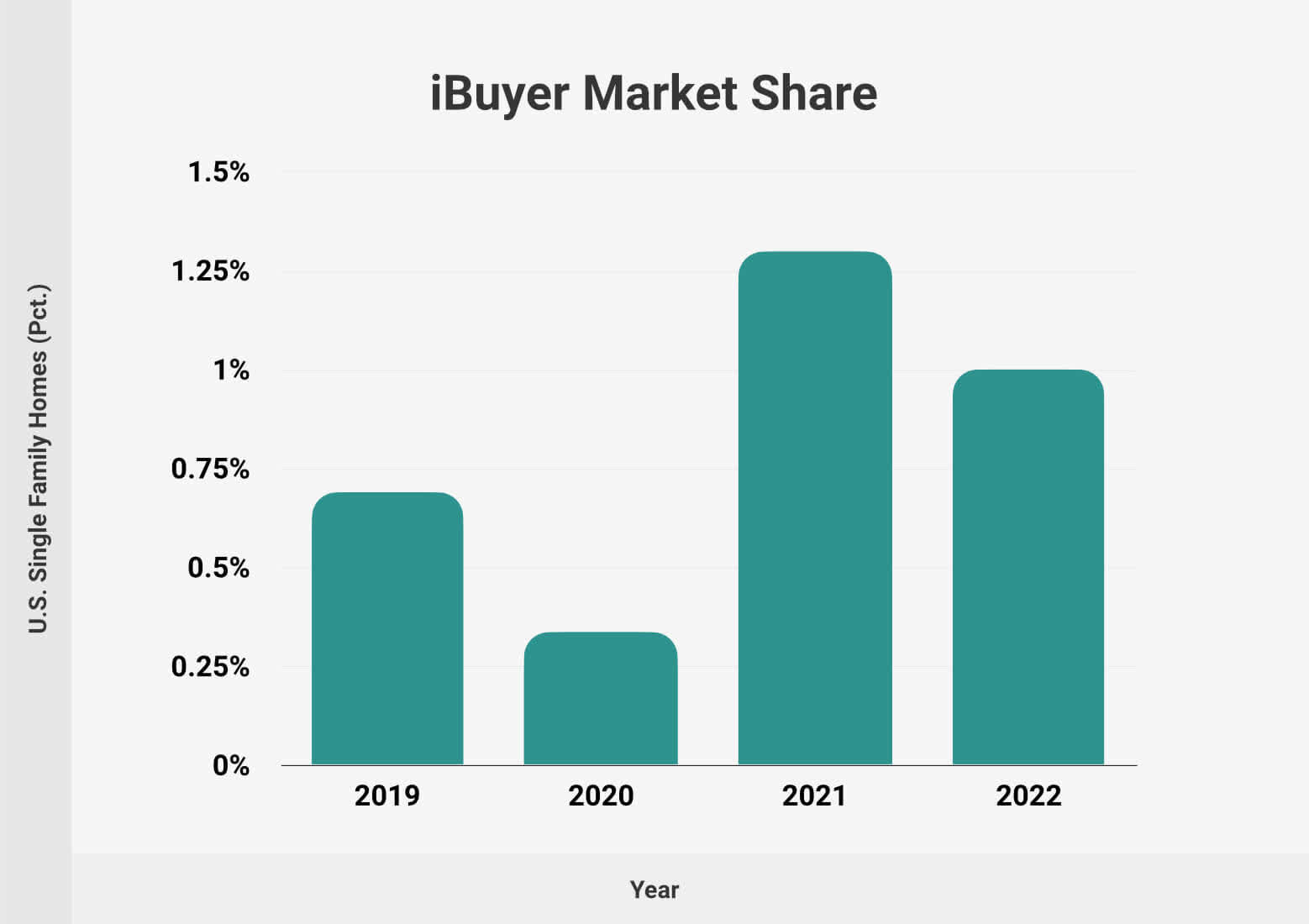 While Residential real estate is a massive market, it is still largely offline. As you can see here, iBuyers only make up 1% of total transactions in 2022, and the drop from 2021 is due to Zillow exiting the iBuying business.
