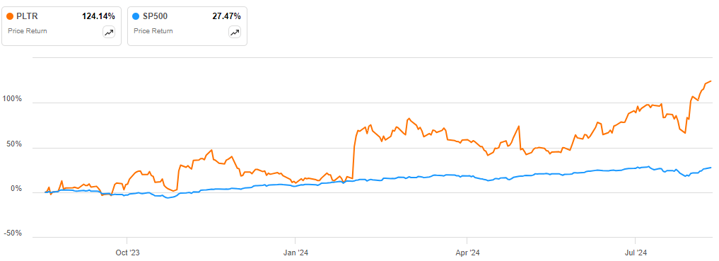 I am bullish on Palantir Technologies (NYSE:PLTR) and I recommend it to investors. The stock has been on a solid uptrend since bouncing off its lows at about $6 in December 2022. Following this upward momentum, it has gained 124.14% over the last year, outperforming the S&P 500 by a margin of more than 96%.
