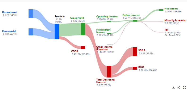 The two platforms are designed to offer interactive, machine-assisted analysis by integrating, safeguarding, and maintaining data to enable human-driven analysis. Initially, the company targeted federal entities of the USIC, but over time it has gradually grown its customer base to include government and private companies both locally and globally. Below is its revenue breakdown by business line and geography.