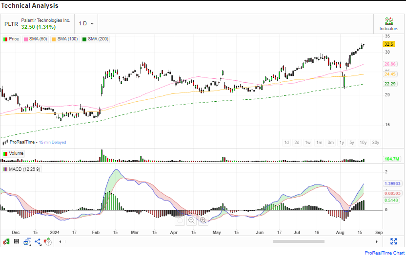 - Palantir Technologies has shown a solid uptrend, gaining 124.14% over the last year, outperforming the S&P 500 by 96%.