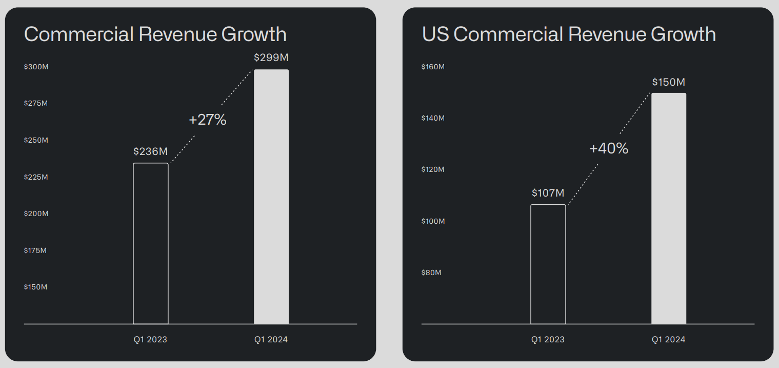 • Palantir’s US Commercial Total Contract Value (TCV) grew by 131% year-on-year in Q1, ahead of Q4 2023’s 107% growth figure. This indicates Palantir is successfully scaling AIP, in my view.