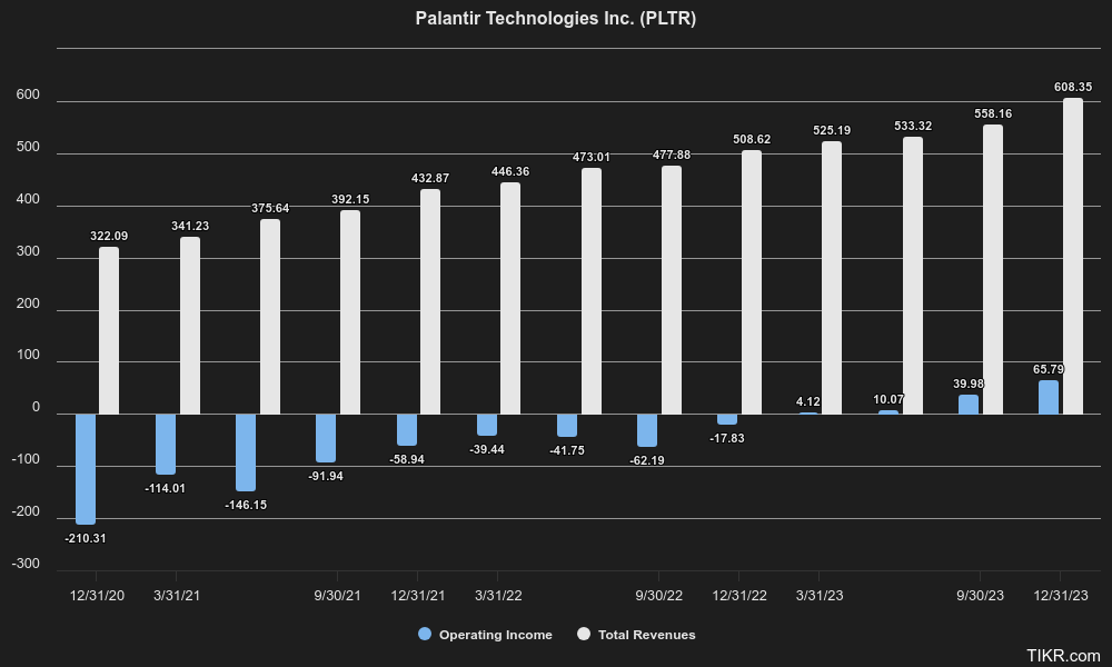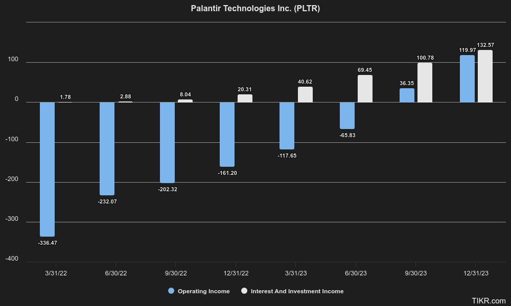 From an operating income perspective, Palantir is currently trading at 197.52x annualized Q4 operating income, which clocked in at $263.16M, which may come as a surprise to some as it is trading at a lower P/E ratio of 122.31 based on Q4 annualized net income of $425M. Something that many analysts actually overlook is, the fact that in the fourth quarter, beyond the $65.79 million in operating income, Palantir generated $44.55 million in interest and investment income from securities such as U.S. Treasuries from Palantir’s $3.67 billion Total Cash And Short Term Investments, combined with the fact that Palantir has hardly any debt.
