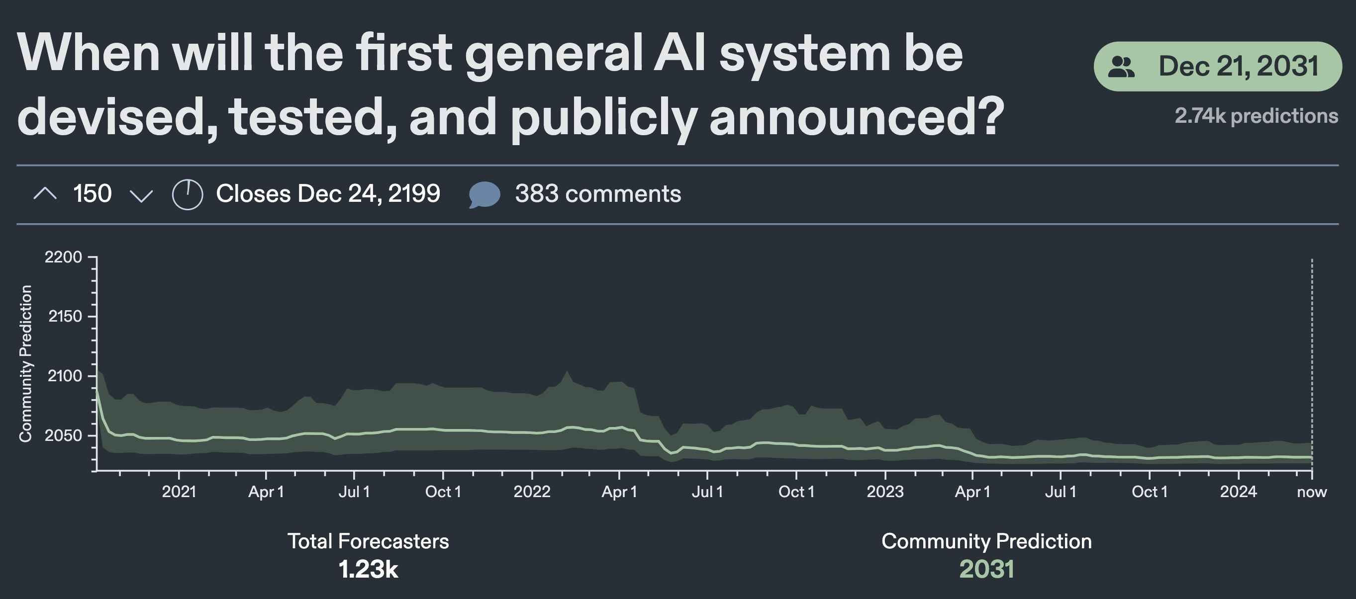 But going back to assessing AI tailwinds, we’ve previously successfully forecasted the advancements in AI using Metaculus, which is a platform that aggregates quantitative predictions from a large community to optimally predict future events. One of the largest polls which asks the question of when the “first general AI system be devised, tested, and publicly announced,” and is currently at December 2031. Before the rally in AI stocks, we saw this timeline shrink from around 2050 to 2030 right up until April 2022 and gave us the judgement that market participants were underpricing future developments in AI. During the recent AI rally, however, over the last 24 months, the timeline has remained fairly flat after the introduction of ChatGPT.