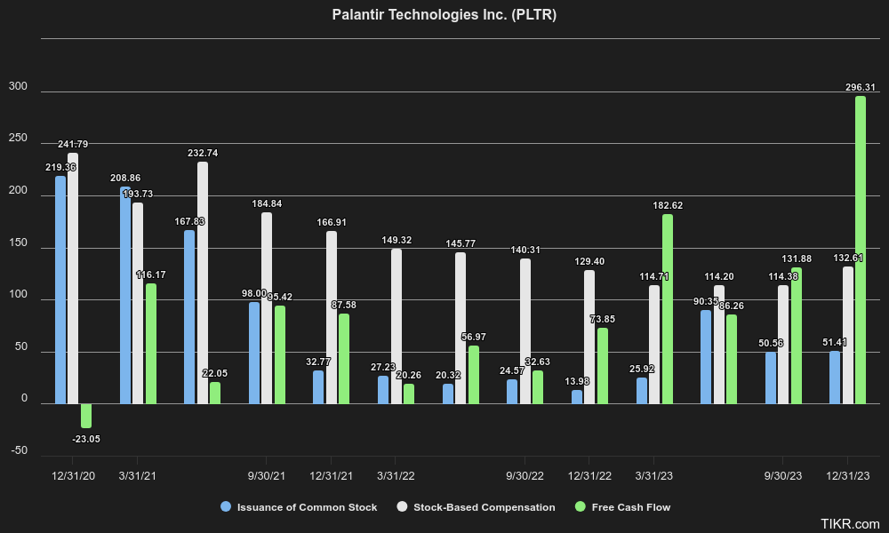 One of Palantir’s founders, Peter Thiel, also sold $174.6M worth of shares, or about 6% of his total holdings, which we would also regard as a red flag. It is unknown why he sold shares, but we think it is probably overvaluation, as Peter Thiel has a net worth of $7.2BN, making it quite unlikely in our judgment that the sale was for liquidity reasons. Palantir itself also issued more shares when the share price rose in 2021 and 2023 instead of raising capital through debt issuance and despite the fact that the company already had ample liquidity on its balance sheet and was cash flow positive.