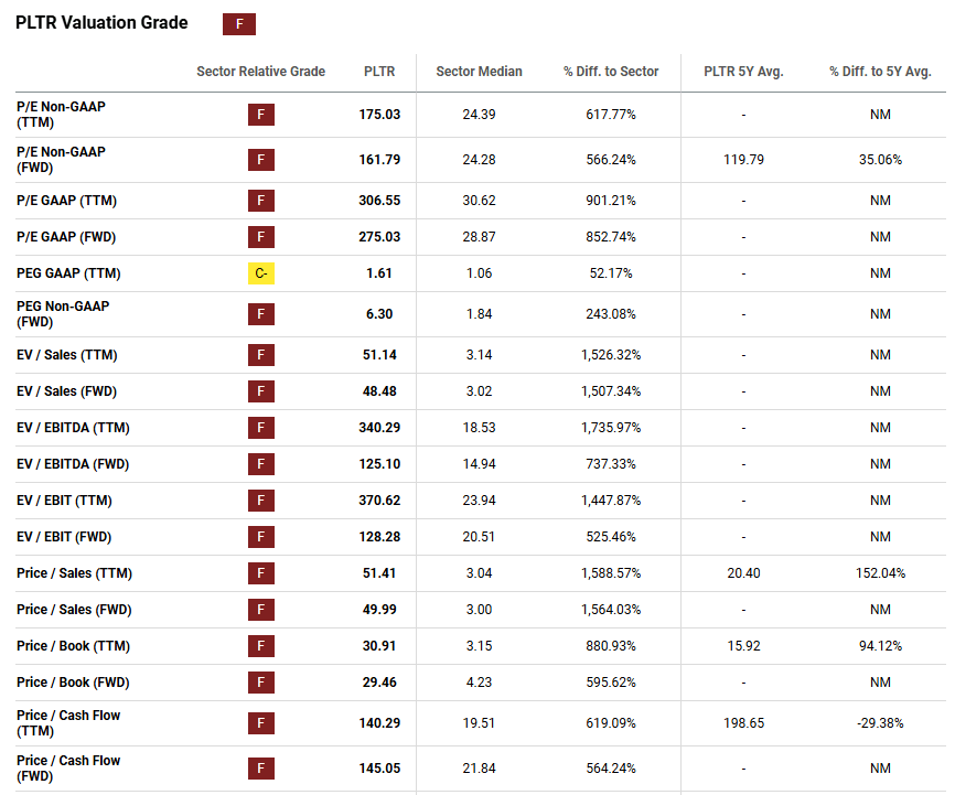 These metrics make PLTR one of the most expensive stocks on the market, and Seeking Alpha’s quant rating system grades PLTR’s valuation at an ‘F’: