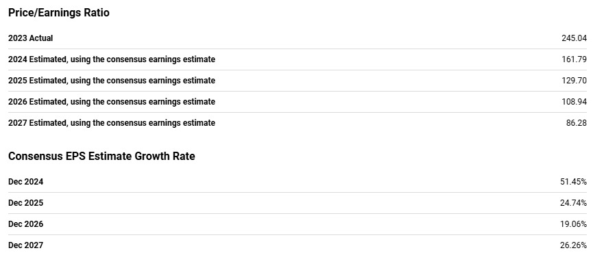 If you take analyst estimates at face value, then at this price, the stock doesn’t reach below a 100x TTM P/E until FY 2027: