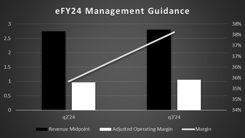 - Management raised FY24 guidance to $2.805-2.809 billion in revenue and $1.054-1.058 billion in adjusted operating margin, with a 38% margin at the midpoint.