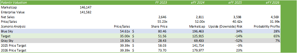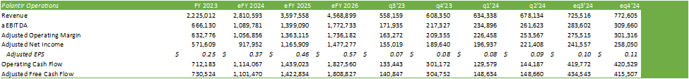 I’m also forecasting Palantir to continue expanding its adjusted operating margin as the firm realizes economies of scale through further customer adoption. I’m forecasting Palantir’s “Rule Of” to expand to 64% for eFY24 and grow to 66% in eFY25. For reference, Palantir calculates its “Rule Of” by adding top-line growth and adjusted operating margin.