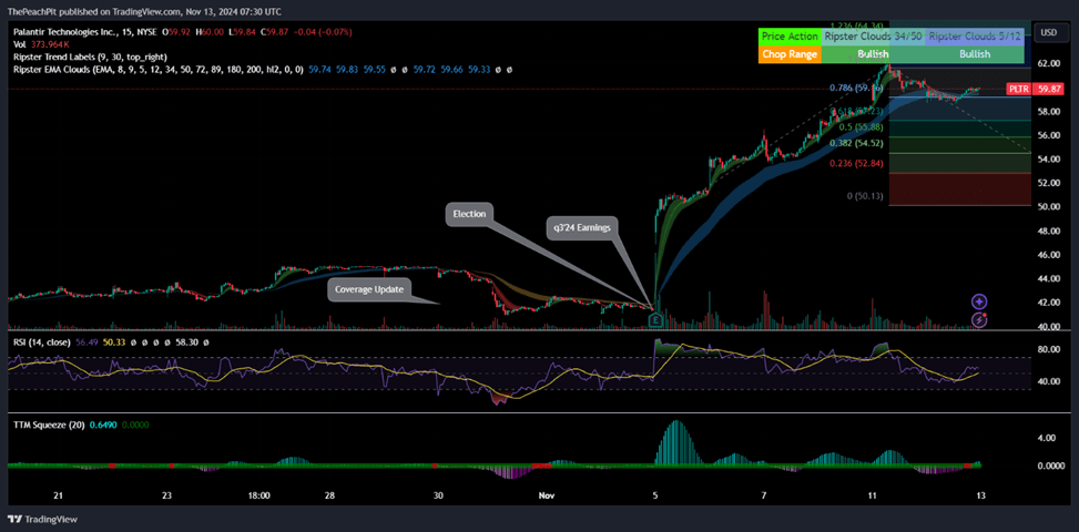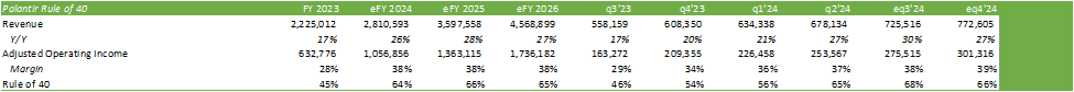 - Palantir reported a strong Q3’24 with 30% revenue growth and a significant adjusted operating margin expansion to 38%, achieving a “Rule Of” 68%.