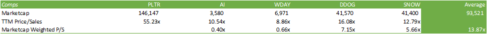 PLTR shares have reached their all-time high in terms of price and valuation, commanding a market cap of $146b at 55x price/sales. PLTR shares are currently trading at a significant premium over its competitors, holding an enterprise-value weighted average price/sales multiple of 13.87x. The purpose of weighting the competitors’ multiples based on enterprise value is to control for size and how much of the market shares command. Despite this high multiple, I believe PLTR’s valuation is justified by its accelerated growth trajectory and its strong profitability.