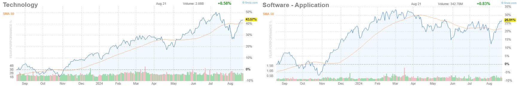 The global application software market is expected to grow at a CAGR of 7.8%, reaching a size of $328.30B through 2032. While the fast expansion of the US technology sector has recently been more supported by companies in the semiconductor and computer hardware industries, the development and adoption of Artificial Intelligence [AI] and Machine Learning [ML] technologies is offering secular growth opportunities to companies involved into the development and integration of software which uses or enhances such technologies. However, the expansion observed in the S&P 500 (SP500) is driven by a handful of stocks, namely NVIDIA Corporation’s Stock (NASDAQ:NVDA) (NVDA:CA), Microsoft Corporation (MSFT), Alphabet Inc. (GOOGL) (GOOG), Meta Platforms, Inc. (META), Apple Inc. (AAPL), and Amazon.com, Inc. (AMZN); which contributed to over 60% of the year-to-date return as of the end of June, before the market pulled back. Such a high dependence on a few stocks raises some questions for companies highly correlated to the technology sector and companies whose valuation multiplied over the past quarters, such as Palantir. The latter’s correlation with the SP500 is increasingly high, reaching 75.90% in July, implying that an eventual more significant correction of the index would cause the stock to suffer accordingly.