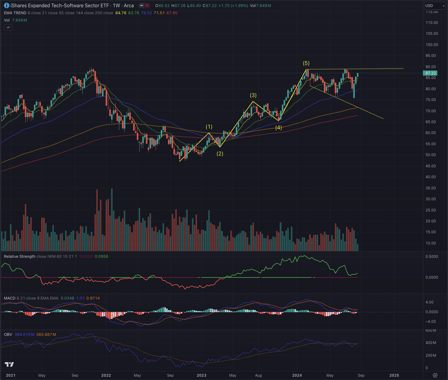The iShares Expanded Tech-Software Sector ETF (IGV) has completed a five-wave Elliott impulse sequence and successively consolidated close to its highest price level while forming a double top at the beginning of July. IGV is forming an expanding triangle in its attempt to form a handle out of a massive cup formation, starting from the peak in November 2021 and bottoming in October 2022.