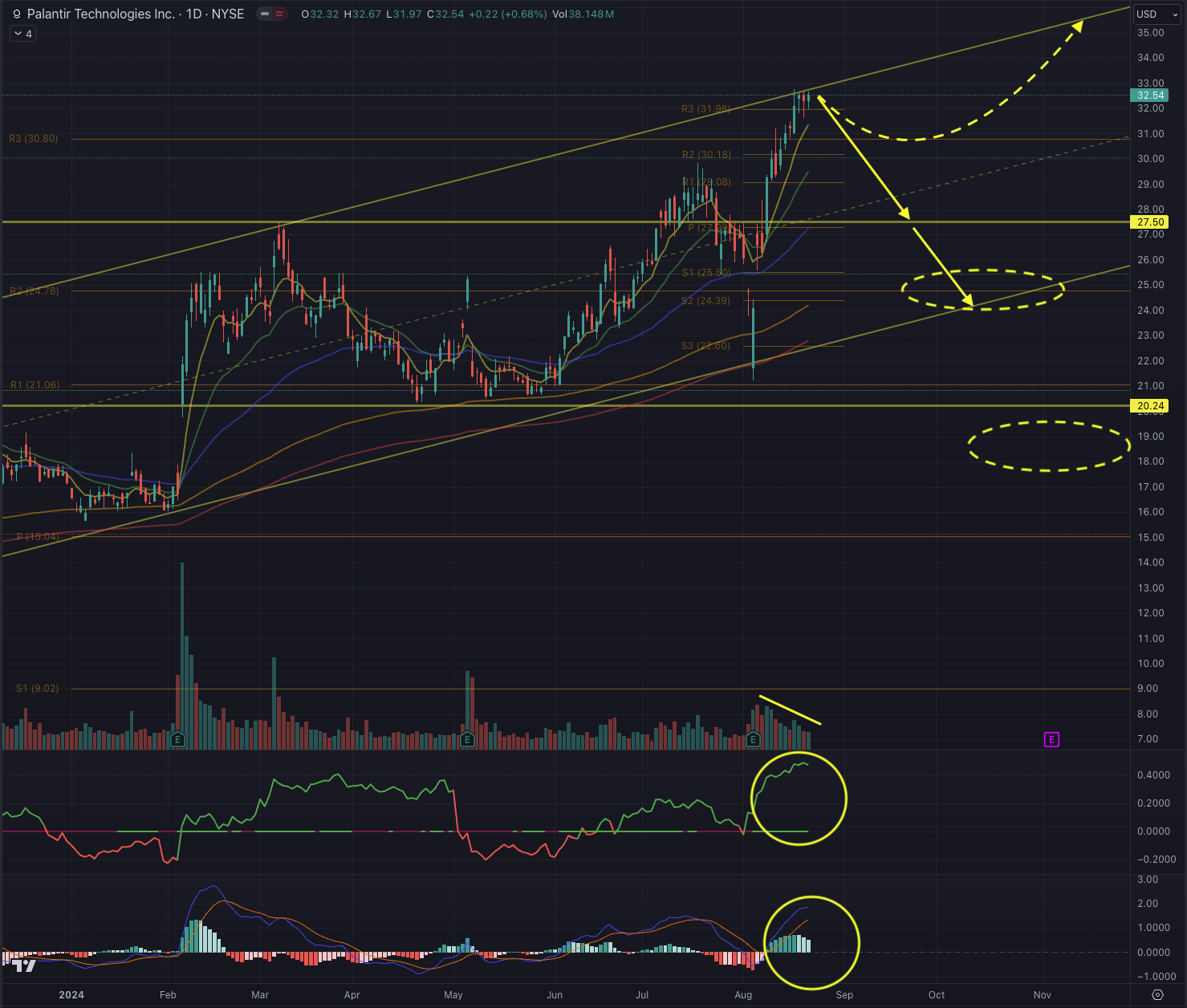 A closer examination of PLTR’s daily chart confirms the critical actual moment. The stock has reached the top of the up trending channel, while this area also corresponds to the 1.618 extensions from the previous drop, which was hinted at in my last article and finally observed during March and April. Additionally, this monthly resistance R3 at $31.98 has been breached, and a liquidity sweep is underway.