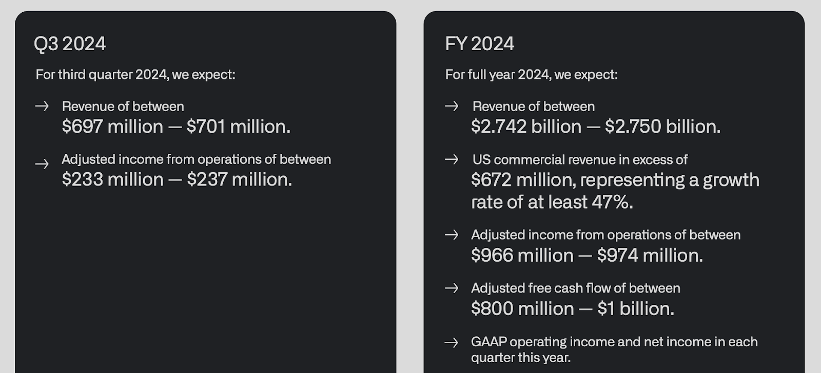 Looking ahead, management has guided for the third quarter to see revenue growth of up to 25% to $701 million. Management also raised full-year revenue guidance from $2.689 billion to $2.75 billion at the high end, as well as profits from $880 million to $974 million. Most enterprise tech firms in my coverage universe struggled to reiterate full-year guidance and even tempered expectations – but PLTR delivered a significant beat and raise.