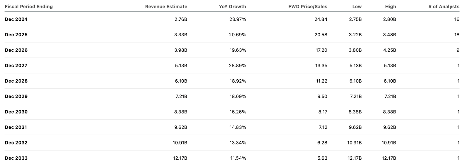 I note that the consensus estimates above already imply an acceleration to 29% revenue growth at some point. But perhaps one believes that revenue growth might accelerate to the 40% range for an additional one of those years. The company then might end up at around $8.5 billion in revenue in 2029. The stock would be trading at around 8x, 2029e sales. Assuming the stock trades at 10x sales by then, we are looking at around 4.5% annualized returns over the next 5 years, or maybe 5.5% to 6% inclusive of the earnings yield. That looks wildly insufficient for what should be regarded as an ultra-bull case.