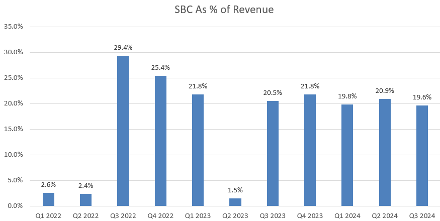 Palantir spent 19.6% of total revenue in stock-based compensation (SBC) in Q3, as depicted in the chart below. As discussed in my previous article, Palantir’s SBC spending is relatively high compared to other software companies. To further expand its operating margin, Palantir needs to reduce SBC expenses.