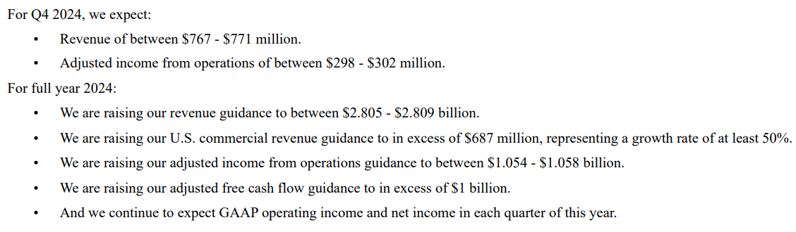 Thanks to their strong results, Palantir raised the revenue and profit guidance for FY24, as detailed below: