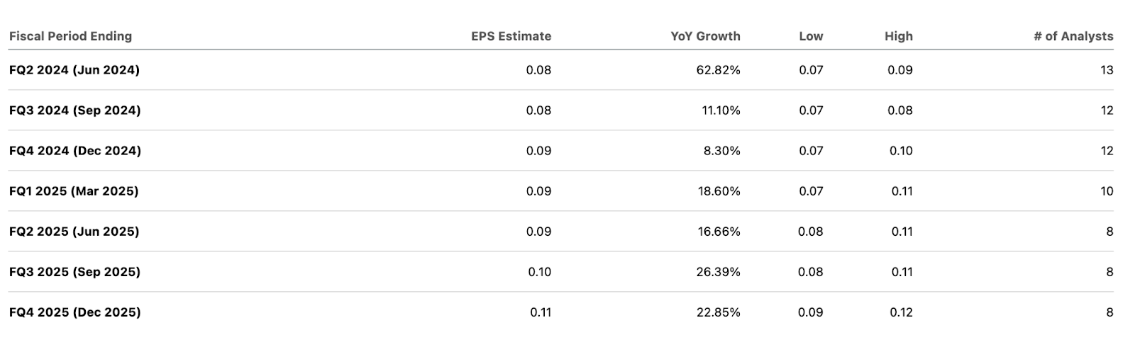 Guidance this quarter will be more important than ever. The market needs to know if the trends powering Palantir will continue. For now, analysts seem confident in Palantir’s ability to continue to produce exponential EPS results, as outlined in the table below: