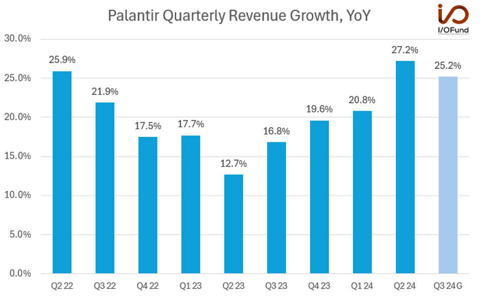 Palantir reported 27.2% YoY revenue growth in Q2, aided by strength in US commercial stemming from AIP as well as government revenue accelerating significantly. Palantir’s YoY revenue growth bottomed in Q2 2023 at 12.7%, the same quarter as AIP’s release, with revenue growth now 15 points higher. Despite guiding for a slight 2 percentage point deceleration in Q3 to 25.2% YoY growth, Palantir would only need to beat its guide by 1.5% to keep this revenue acceleration intact.