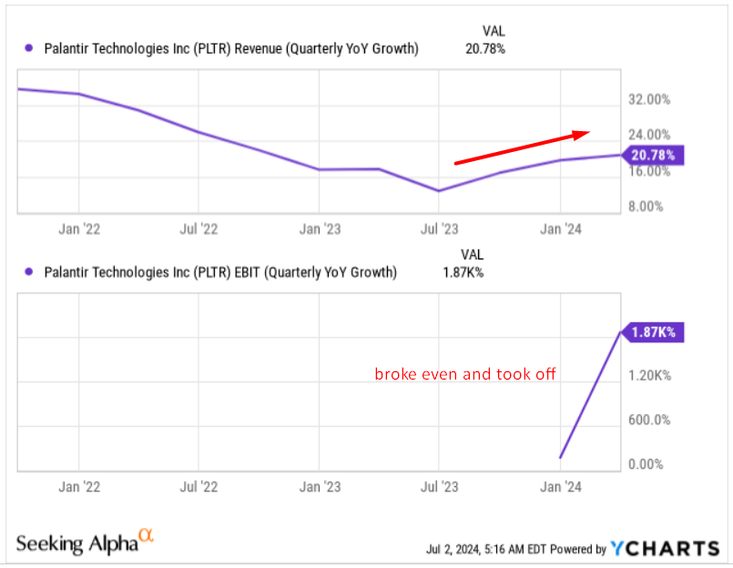 - PLTR’s business shows acceleration in revenue growth due to AIP boot camps, widening margins after first profit six quarters ago, and apparent stability in operational processes.