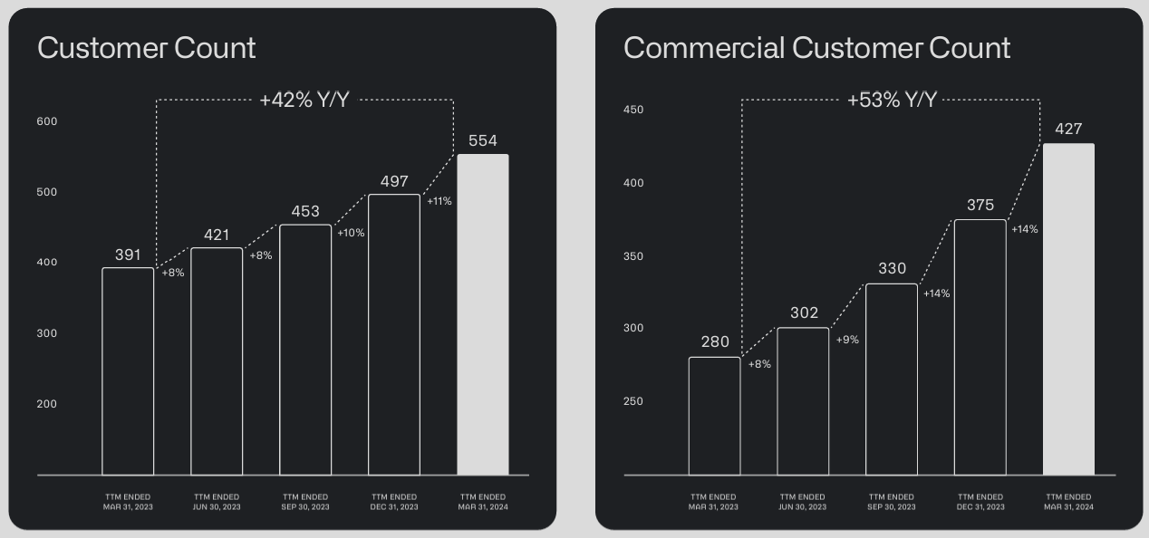I think the market underestimates the true growth potential of the company. Like many enterprise software companies, Palantir relies on new AI-powered applications to grow its business. PLTR’s big advantage is that its go-to-market approach is centered on its direct sales force to grow both its customer base and the wallet within that customer base. In theory, Palantir offers its customers pretty good customization, a kind of consultancy, but as far as I know, with a ready-made, unique platform that the company has been developing for years (unlike many start-ups that have only recently emerged). As noted during earnings calls, they aim to secure 5-year contracts with clients, which is a relatively long period, in my view, reflecting the complexity of its solutions (and as the customer base grows rapidly, this speaks to the uniqueness of Palantir’s products, which are highly valued when customers are willing to sign such long contracts).