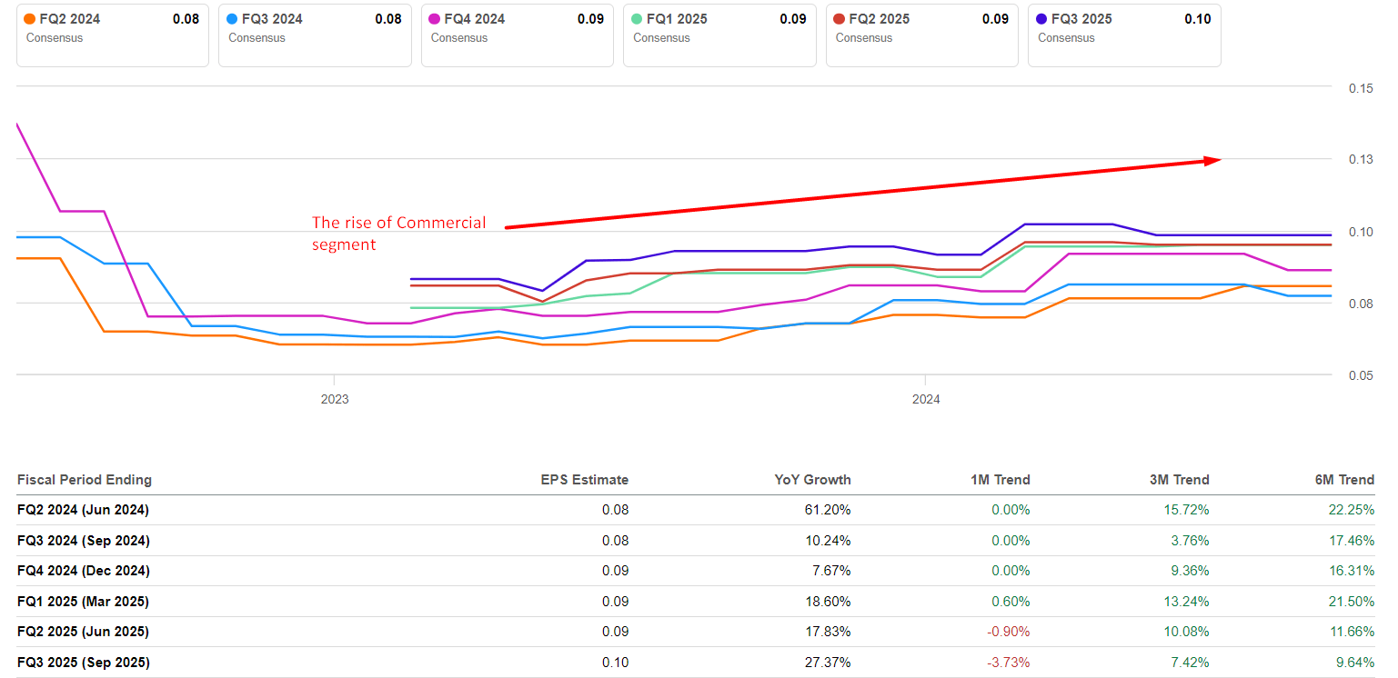 So, in my opinion, Palantir’s business is indeed booming. The company has long been known for serving the needs of the US defense and intelligence community, but the company’s expansion into the commercial sector with data management and analytics platforms that can provide solutions to complex business problems has been a game changer in terms of higher margin revenue growth. Actual growth is higher from quarter to quarter than analysts and management itself initially assume – which is why EPS expectations are steadily rising in light of management’s positive guidance revisions.