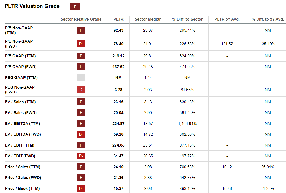Seeking Alpha’s Quant System rates PLTR stock as an “F” on its Valuation metrics, but if you look closely, you’ll see that most of those metrics are “backward-looking” rather than “forward-looking.”