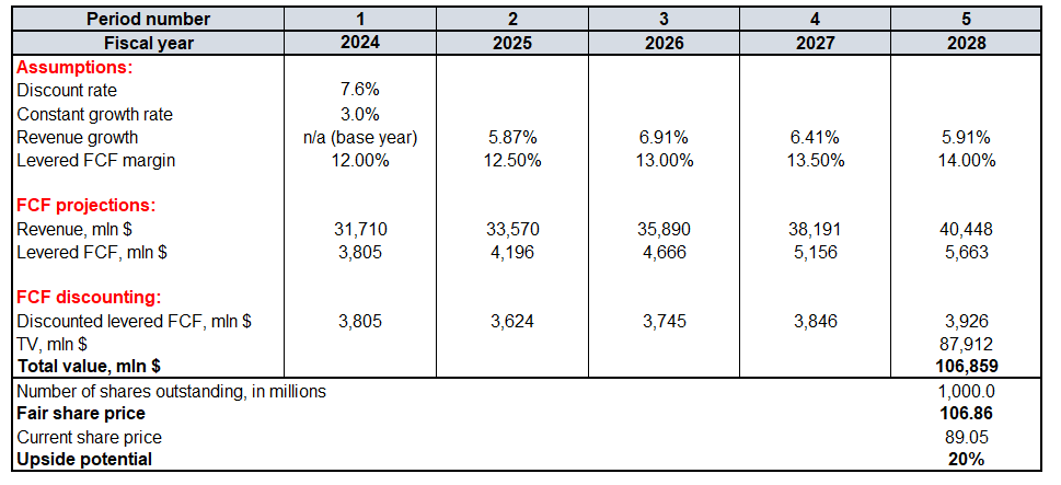 The DCF model will help in determining the upside potential based on the fair value estimation. PayPal’s WACC is 7.6%. The company’s FY2024-2026 revenue projection is covered extensively by Wall Street analysts (31 analysts), which makes consensus a reliable source. For FY2027-2028, a steady revenue growth deceleration is incorporated. The levered FCF margin is almost 12%. Since the management focuses on profitable growth (and delivers on its promises), I expect the FCF margin to expand by at least 50 basis points annually. The constant growth rate is conservative at 3% and Seeking Alpha suggests that there are 1 billion shares outstanding.