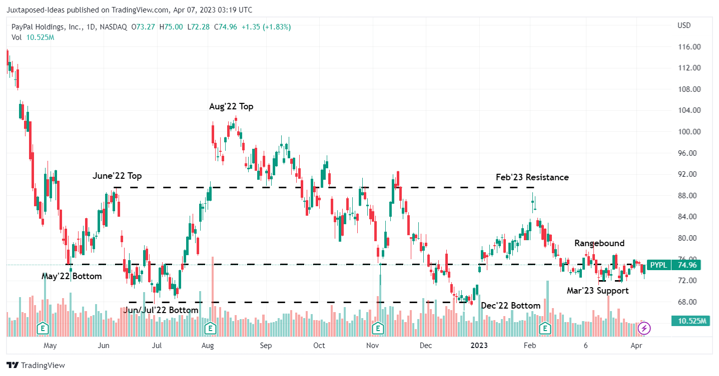 PayPal (NASDAQ:PYPL) has continued to trade range-bound over the past two months, despite the excellent double beats in the FQ4’22 earnings call and impressive forward guidance.